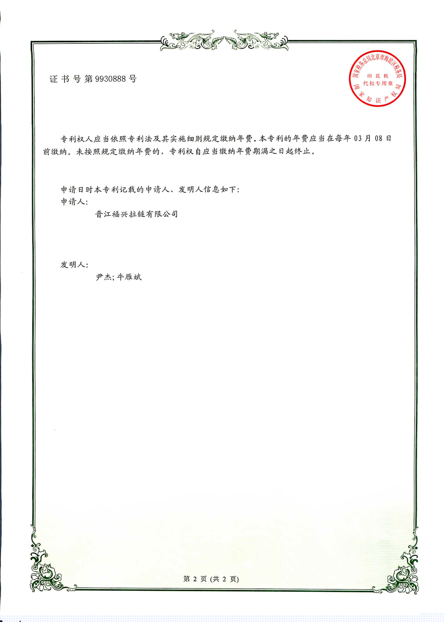 实用新型发明专利(第930888号)